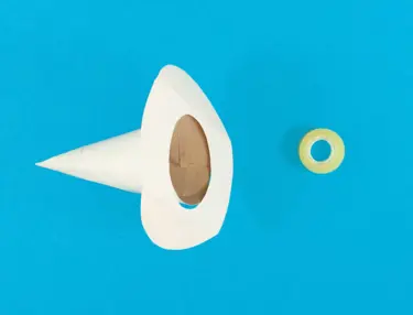 Schneide zuerst eine leere Tempo Box auf und streiche sie glatt. Schneide die Enden ab und rolle sie dann in eine Kegelform. Befestige sie mit Klebeband und schneide dann den überschüssigen Karton um den Boden des Kegels herum ab.