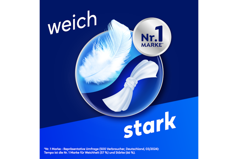 - Nr.1 Marke - Repräsentative Umfrage (500 Verbraucher, Deutschland, 03/2024): Tempo ist die Nr.1 Marke für Weichheit (57%) und Stärke (66%)).
