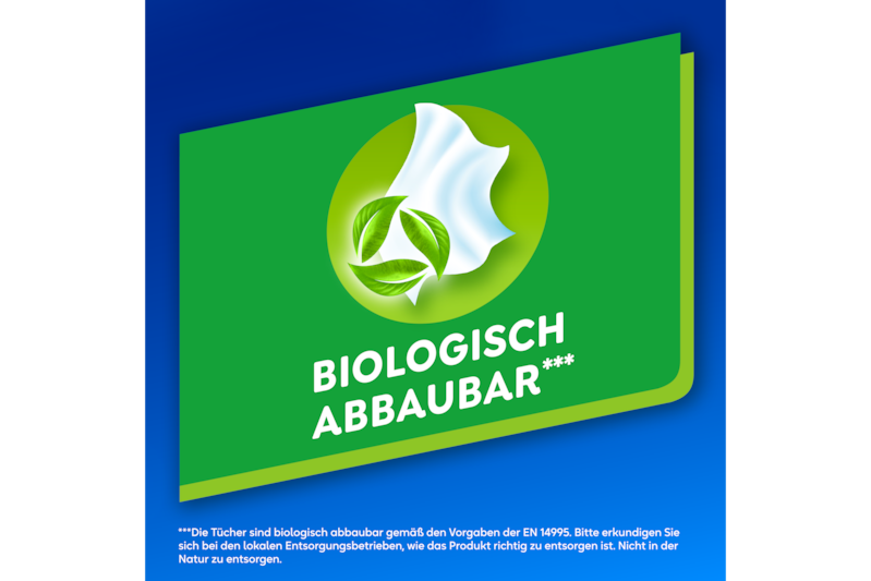 - Die Tücher sind biologisch abbaubar gemäß den Vorgaben der EN 14995. Bitte erkundigen Sie sich bei den lokalen Entsorgungsbetrieben, wie das Produkt richtig zu entsorgen ist. Nicht in der Natur zu entsorgen.
